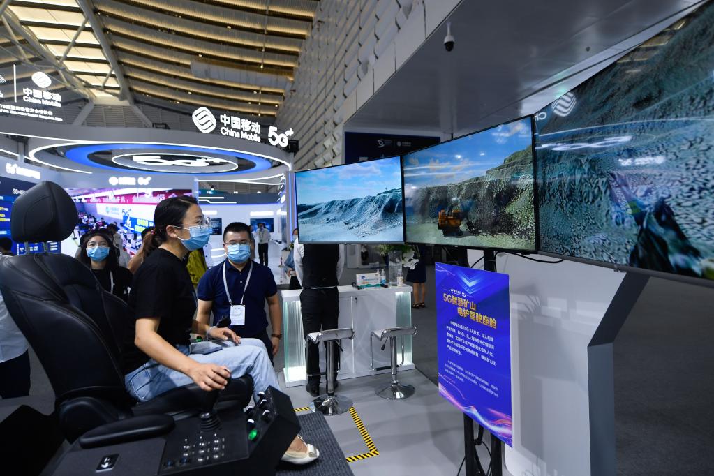 观众在2021年世界互联网大会“互联网之光”博览会的中国电信展台体验5G智慧矿山电铲驾驶座舱 (新华社记者黄宗治 摄)