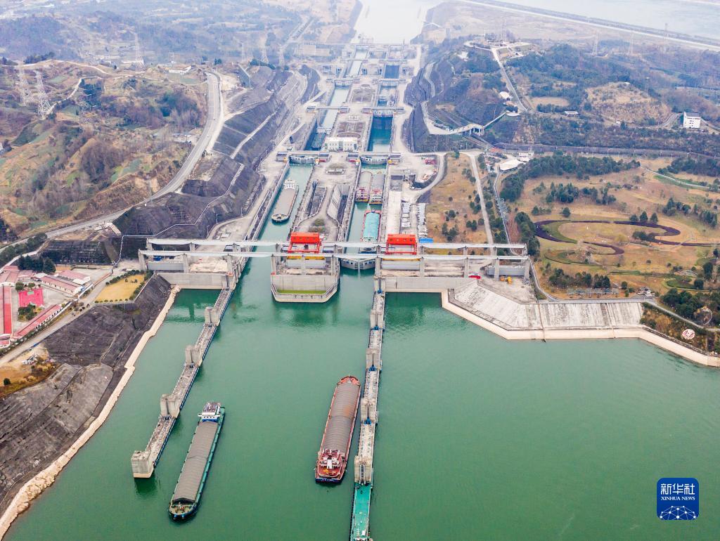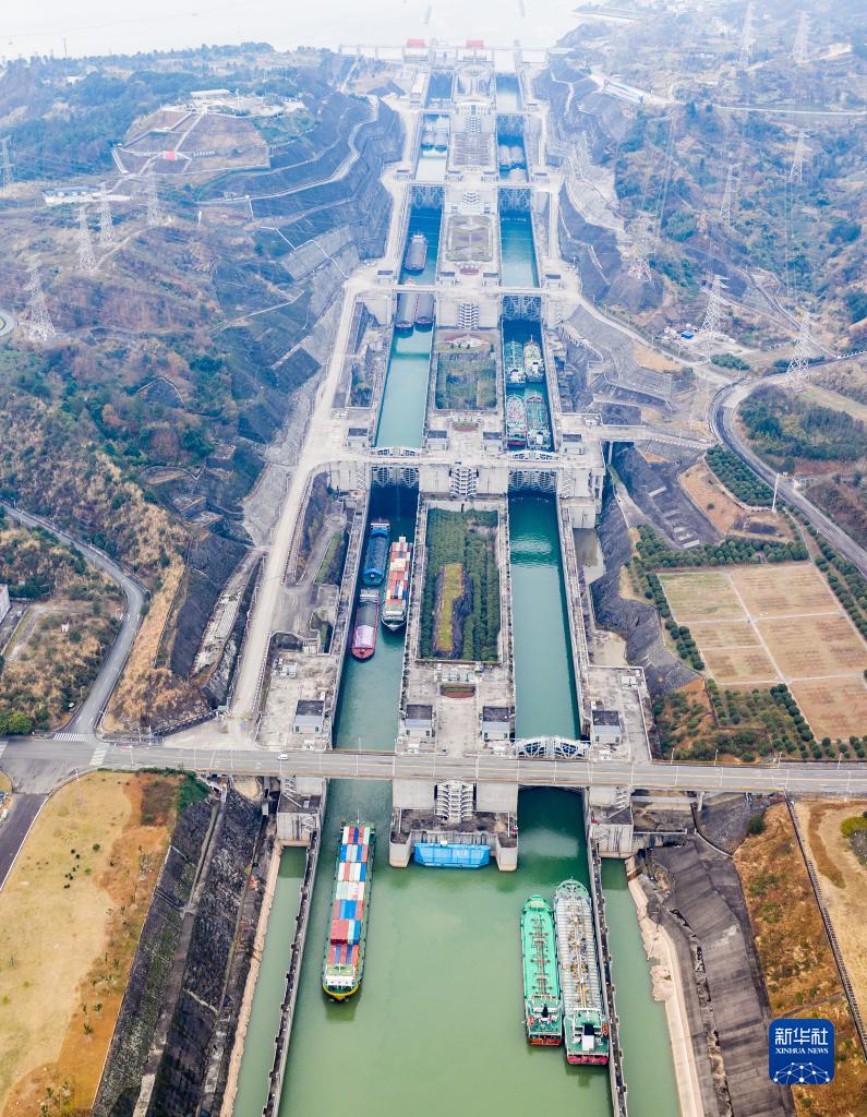 12月27日,船舶有序通过三峡五级船闸(无人机照片)。新华社发(郑家裕 摄)