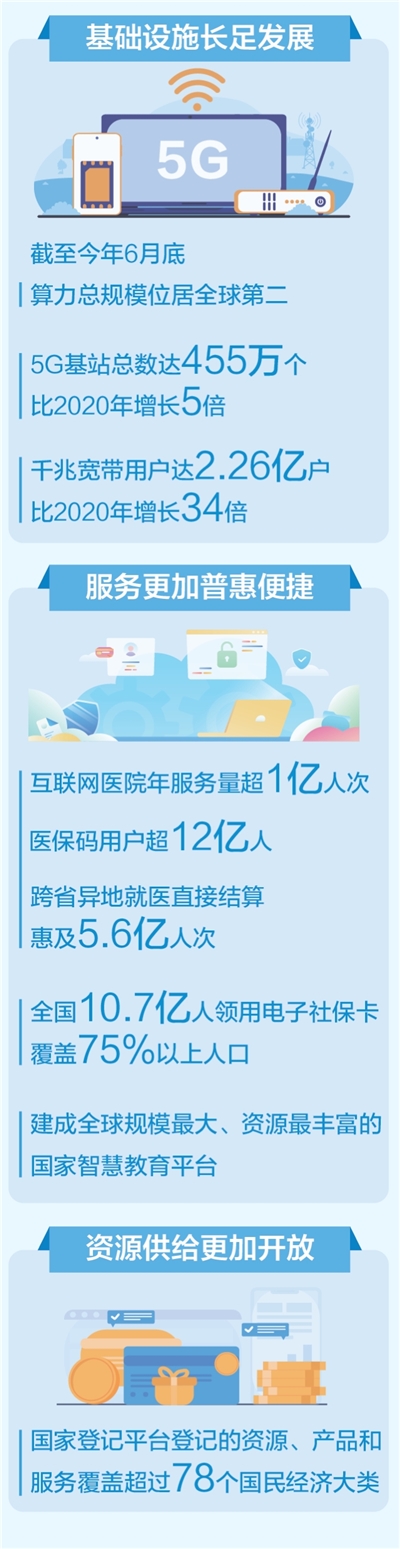 公共服务更加普惠便捷。智慧医疗服务扩面提速,全国互联网医院年服务量超过1亿人次,全国医保码用户超过12亿人,跨省异地就医直接结算惠及5.6亿人次。数字教育扩容升级,我国已建成全球规模最大、资源最丰富的国家智慧教育平台。数字社保扩围增效,全国10.7亿人领用电子社保卡,覆盖75%以上人口,长三角、成渝等城市群逐步实现“一卡通”区域服务互联互通。数字养老服务取得积极成效,全国养老服务信息平台上线,促进养老服务资源供需高效对接。