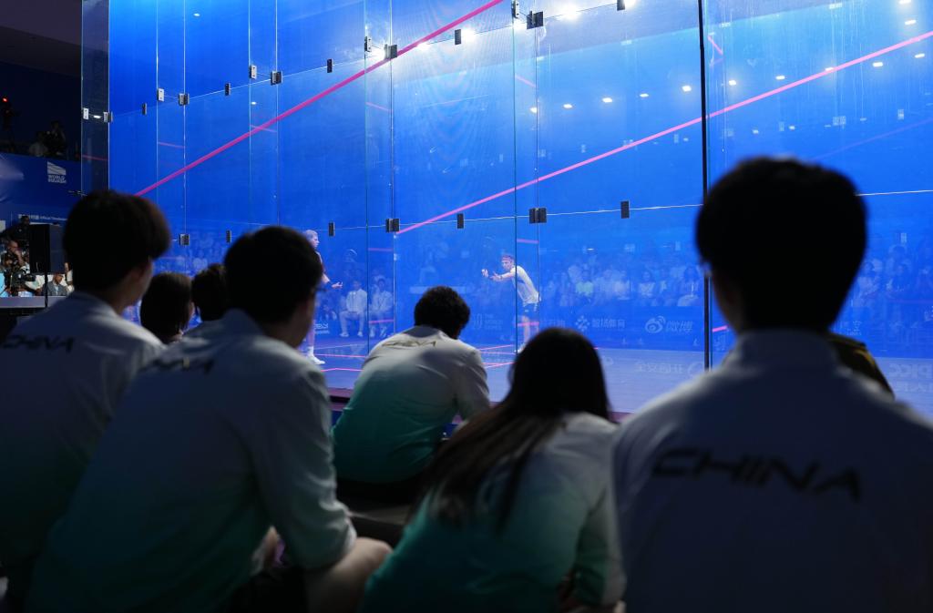 8月12日,中国壁球队在场边观看男子单打决赛。当日,在2025年成都世运会壁球男子单打金牌赛中,法国选手克鲁安战胜匈牙利选手福尔考什,夺得冠军。新华社记者 李旭伦 摄