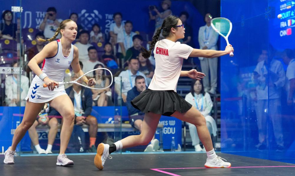 8月10日,刘子仪(右)在比赛中回球。当日,在2025年成都世运会壁球女子单打遗材赛四分之一决赛中,中国选手刘子仪不敌法国选手莱娅·巴尔博。新华社记者 李旭伦 摄