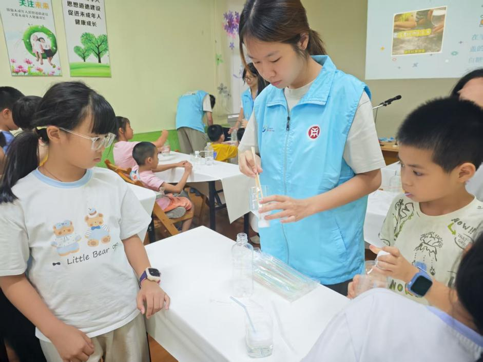 图为实践队队员指导科普课学生做实验。范秋霞供图