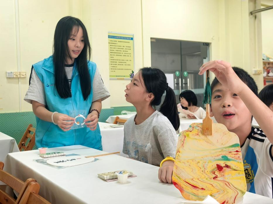 图为实践队成员指导学生完成漆扇制作。陈彦伊供图