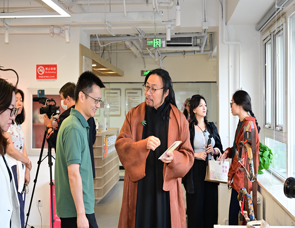 三里屯非遗会客厅负责人张垚为宣传部史先礼部长、文旅局王令局长讲解“到民间去”参展作品