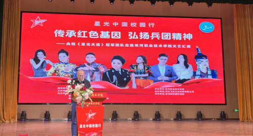 演出在主持人赵鹏、汪瑶瑶热情洋溢的欢迎词中拉开帷幕。随后,主持人介绍了出席活动的各位嘉宾。双河职业技术学院沈国华副院长与星光中国行创始人、《星光大道》歌手段云潇先后上台致辞,他们共同强调了传承红色基因、弘扬兵团精神对于当代青年成长成才的重要性,并对本次活动的成功举办表示热烈祝贺。