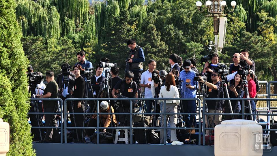 △9月30日,天安门广场上现场报道的记者。(总台央视记者鄂介甫拍摄)