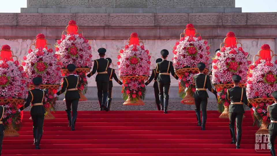18名礼兵稳稳抬起花篮,缓步走向人民英雄纪念碑,将花篮摆放在纪念碑基座上。