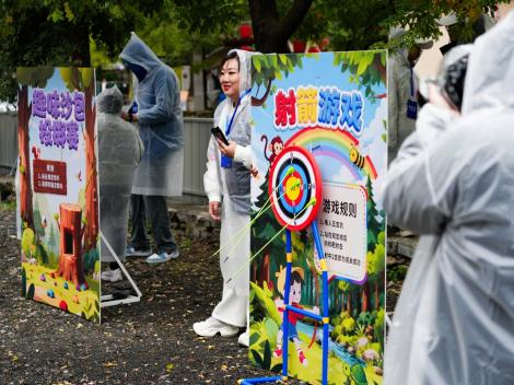 为让不同人群都能融入活动,现场特设四大互动游戏区,兼顾传统雅趣与户外活力。大家可体验投壶、射箭,感受古人的休闲雅致;组队玩沙包投球、投飞盘,在奔跑与传接间释放活力。每个游戏区都有工作人员引导,无论老少,都能在轻松欢乐的氛围中找到属于自己的乐趣,留下专属于爨底下村的秋日记忆。