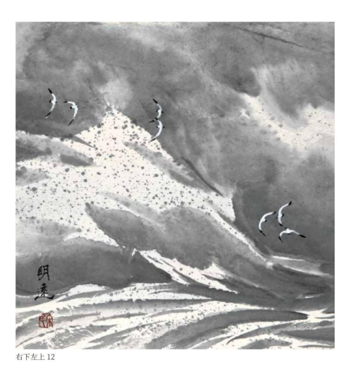 留白是中国画传统技法之一,在画水中起到以虚代实、暗示水的存在、体现水的质感与动态、拓展意境、引发联想等不可替代的作用。《马远水》完美运用留白作为画面的主要构成部分,服务于整体布局的需要。宋明远也继承与运用留白做为构图元素存在,同时还将其发展为表现浪花与水雾的重要方法,也运用它作为处理海水反射太阳光芒,表达海水气体流动的方法。