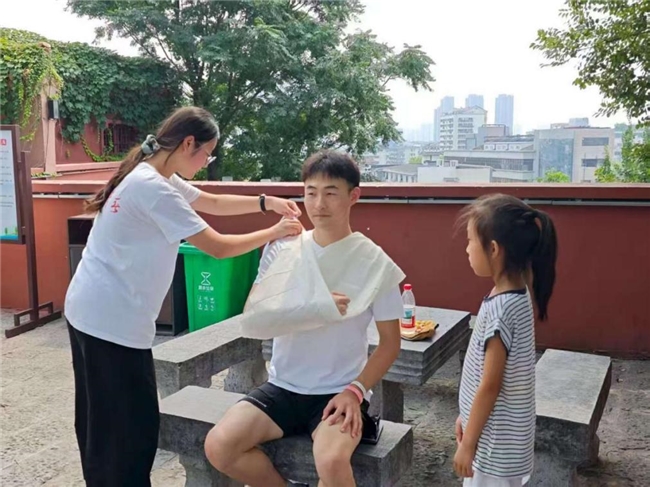 7月15日上午,在江苏省徐州市云龙区戏马台景区内,“救星燎原”实践团开展“‘救’在身边,急救星火计划”公益活动。活动现场,志愿者展开急救知识讲解,如心肺复苏的具体规范,以及三角巾包扎、绷带包扎的实操教学,让急救教学更具文化内涵与记忆点。 在“伤口包扎实操区”,志愿者们详细介绍了两种包扎方法。绷带包扎适用于四肢伤口,先在伤口附近做几圈环形包扎固定,再将绷带向上螺旋缠绕,每圈覆盖前一圈的1/3至1/2,直至完全覆盖伤口,最后固定绷带末端。三角巾包扎法则适用于头部、肩部、手臂等不同部位,针对不同部位有着具体的操作步骤,志愿者强调包扎需牢固、覆盖伤口,打结避开创伤,依部位选对应方法,及时包扎可防感染,为治疗争取时间。 许多游客积极参与实操,在志愿者一对一的指导下很快熟练掌握了技能。活动结束后,志愿者们发放融合戏马台文化元素的急救宣传单,图文并茂介绍常见急救场景处理方法,深受游客喜爱。游客们纷纷点赞,称活动“既有趣又实用,学到了真本事”。