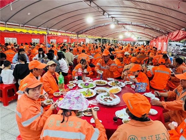 随后,华怀健书记与400多名环卫工人一同共进晚餐。席间,欢声笑语不断,暖意融融。一顿简朴而充满敬意的饭菜,传递的是深深的谢意和浓浓的温情。环卫工人们纷纷表示,这次活动让他们深切感受到了自身的价值和职业的荣光,今后将继续发扬爱岗敬业、吃苦耐劳的精神,以更加饱满的热情投入到工作中,把鳌江打扮得更加整洁、靓丽。