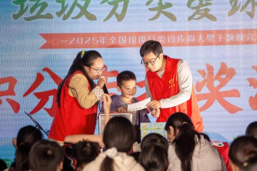 儿童专区同样精彩纷呈。摇摇乒乓球比拼、协作“夹爆气球”等趣味游戏,让孩子们在协作互动中种下绿色环保的种子。穿插在晚会中的分类知识有奖问答环节,更是掀起全场参与热潮。“过期药品属于哪类?”“废旧电池该如何投放?”面对一个个贴近生活的问题,居民们争相举手抢答,据统计,70%参与者的答题正确率超九成,充分彰显分类知识普及的扎实成效。