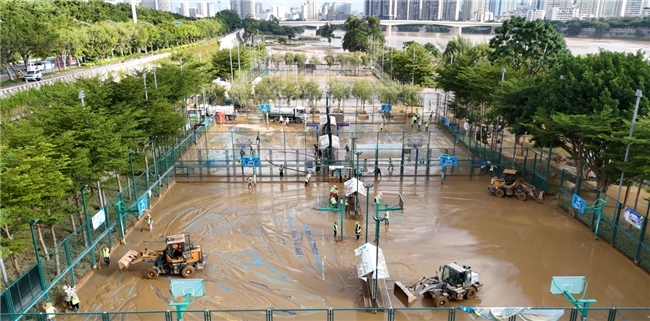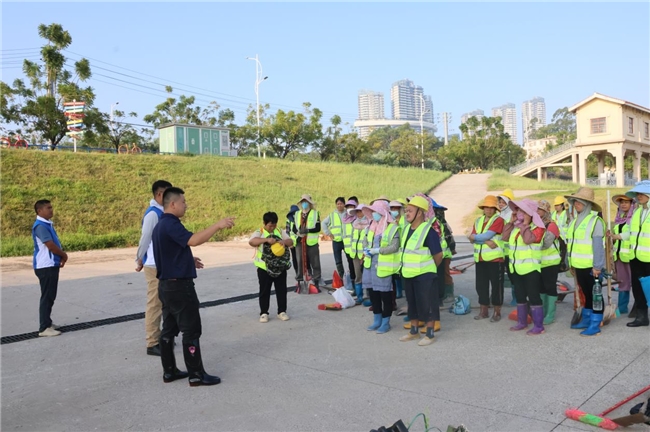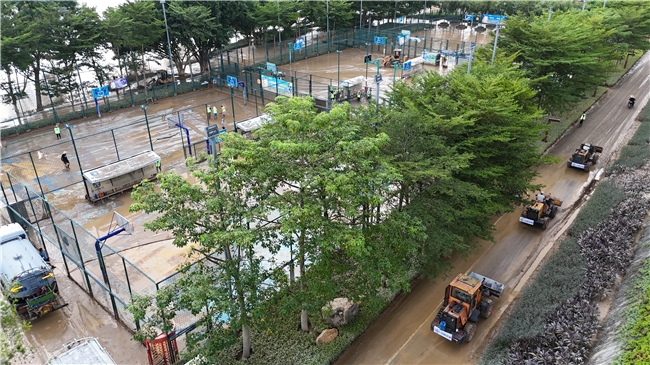 “民生码头水位已降至安全线,铲车组立刻进场清淤!”10月12日清晨,随着项目负责人的指令下达,33台铲车、12台水车、7台挖机组成的抢险队伍分四路出发,奔赴四大抢险点。此次行动,项目共投入8名经验丰富的管理人员组成蓝马甲志愿者小组进行现场调度,150名工人分成10个作业小组,每一组都配备“清淤+修复+消杀”的全能力量——这是项目团队结合前期安全培训,针对洪后处置制定的“模块化作战”方案。