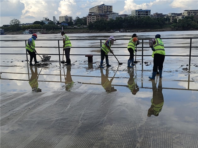 民生码头、蒲庙码头、孔庙码头:清淤+加固,守好“水上通道”。作为南宁市重要的便民码头,民生码头和蒲庙码头沿岸淤积着厚厚的泥沙,还夹杂着大量漂浮物。抢险团队先用铲车开辟出“作业通道”,再由工人用高压水枪冲洗码头地面。针对码头引桥栏杆松动、系船柱锈蚀的问题,立即用备用钢材进行临时加固,确保后续市民通行安全。
