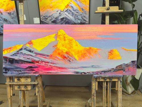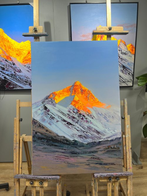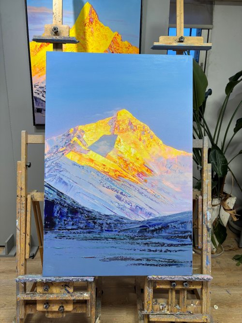 本次展出的《日照金山系列》创作于2023年至2025年间,灵感源自尹琴琴多次赴川西、滇北的实地写生。她以“一天中不同时段的光线变化”为线索,通过厚涂、刮擦、滴洒等技法,在画布上复现雪山从晨曦微露到暮色四合的色彩渐变。例如,代表作《日照金山·晨》中,她用柠檬黄与钛白的叠加表现初升太阳的穿透力,而《日照金山·暮》则通过普蓝与赭石的混合营造出雪峰的冷峻与神秘。