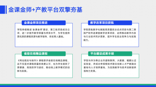 学院持续推进“金课金师”建设,第三批金课金师项目成功立项,《网站规划与制作》 获评省级在线精品课程。同时,学院获批数字化赋能高质量就业试点项目、第二期国产软件进课堂教学改革项目,推动教学内容与行业技术同步更新。在平台建设方面,学院与华为等企业共建物联网、大数据、鲲鹏认证实验室,并成功申报根技术联合创新人才产教融合基地与根技术联合创新人才培养基地,为实践教学与技术创新提供强有力支撑。