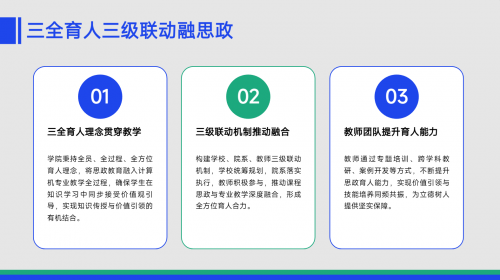 学院将“全员育人、全过程育人、全方位育人”理念贯穿计算机专业教学全过程,通过构建“学校—院系—教师”三级联动机制,推动课程思政与专业教学深度融合。教师团队通过专题培训、跨学科教研、案例开发等方式,提升思政育人能力,实现价值引领与技能培养同频共振。