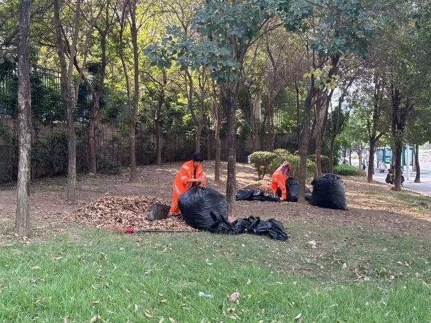 对落叶密集路段实施“定岗+巡回”双重保洁机制,安排专人实时巡查路面落叶情况,确保问题早发现、早处置;小型吸扫车沿着干道匀速行驶,高效吸扫路面绝大部分落叶;对于机械作业难以触及的道路边角、绿化带缝隙、公交站台下方等“死角”,环卫工人则手持扫帚、畚斗细致清扫,巡回收集散落落叶。