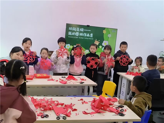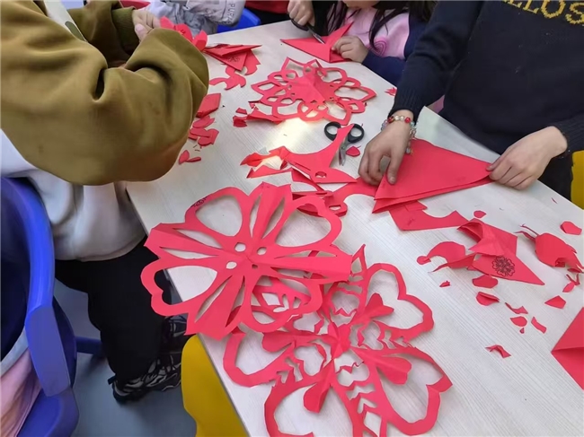 活动现场,志愿者以生动有趣的民间故事开篇,结合孩子们熟悉的卡通形象动画视频,为孩子们介绍了庆阳剪纸的历史渊源。从古代用于节庆装饰、祈福纳祥,到如今成为展现陇东地域文化的重要载体,孩子们在视听交织中直观感知着剪纸的艺术魅力。随后的动手环节,志愿者为孩子们分发了彩纸和安全剪刀,并手把手教授折纸、画稿与裁剪的基本技巧,孩子们积极参与,动手尝试,创作出了形式多样的剪纸作品:既有结构规整的多层花瓣梅花纹样,也有融合现代元素的星形对称窗花,还有将传统回纹与童趣图案巧妙结合的设计。指尖翻飞间,一张张普通彩纸变成了充满童趣的创意作品,现场气氛活跃,欢声笑语不断。活动尾声,志愿者与老师对表现优异的小朋友给予表扬,并赠送了亲手制作的剪纸作品作为奖励,进一步激发了孩子们对剪纸的浓厚兴趣。