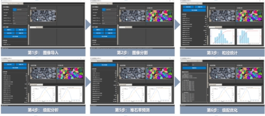 该技术具备以下三大核心优势:1.自动化图像采集:自研双摄像头联动抓拍算法,地面摄像头开展车辆识别,当运输车进入地磅区域后,可自动控制俯拍摄像头抓拍运输车厢体内石块图像,并通过车厢几何控制点进行高精度图像自动矫正。2.图像大模型赋能 :利用前沿的SAM图像大模型,实现堆石图像的精准识别与快速块体分割,可提供精细化的粒径统计与分析图表(包括石块数量、最大最小粒径、超径与逊径含量等);采用云端GPU加速计算,相比传统CPU处理效率提升30倍以上,极大提升图像分析效率。3. AI驱动堆石率预测 :基于现场堆石尺寸实测统计数据,联合PFC3D离散元模拟与机器学习,构建了堆石率预测大模型,精准关联级配分布与堆石率,可结合单车或多浇筑仓粒径分析结果,为堆石率预测与级配优化提供核心支撑。