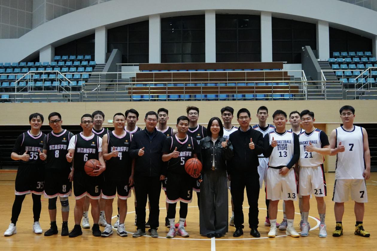 近日,浙江音乐学院体育馆内,一场跨越教育与金融领域的篮球友谊赛在此热血开赛。浙江音乐学院教工篮球队与宁波银行杭州九堡支行篮球队同场竞技,以篮球为媒,在攻防交锋中凝聚校企情谊。这场赛事不仅是一场酣畅淋漓的体育交流,更是双方深化互信、共探合作的生动实践。