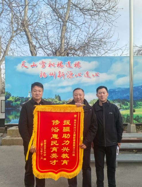 近日,新源县教育局党委委员马山峰、新源县第五中学党总支书记于海洋代表全体师生,向扬州援疆工作组赠送了印着“援疆助力兴教育,修浴惠民育英才”的锦旗,鲜红的锦旗上凝结着师生对援疆深情的真挚谢意。