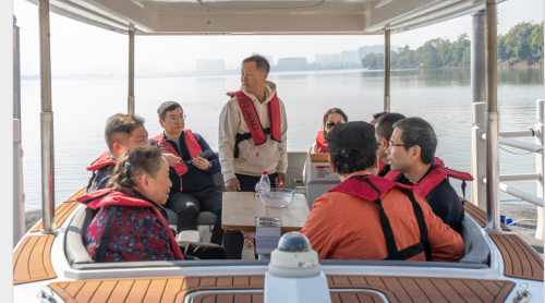 江西省农业厅原副厅长(正厅级)刘极灿、南昌市原常委、警备区原政委张国华等领导,行业意见领袖及权威媒体齐聚现场,共同见证这一历史性时刻。在“让我们荡起双桨”的悠扬歌声中,首批10艘泡泡豚智能游艇“PT600”系列载着游客,从艾溪湖游客码头轻快驶离,开启2公里无人智能游船观光专线的湖中之旅。而这一文旅新场景的落地,离不开江西喜马拉雅影业有限公司董事长刘阳平的远见卓识与不懈推动。