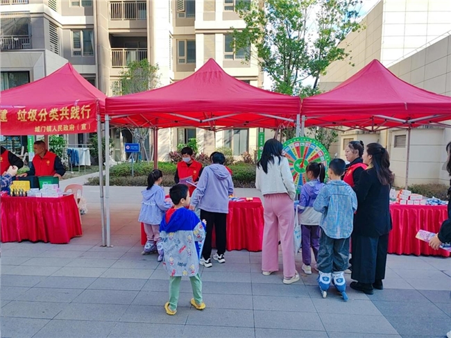 在城门镇主会场现场精心规划了三大特色功能板块,分别是知识宣传区、互动体验区和有奖问答区。三大板块相互配合、层层递进,全方位打造沉浸式学习场景,有效引导居民主动参与到垃圾分类知识的学习与实践中。
