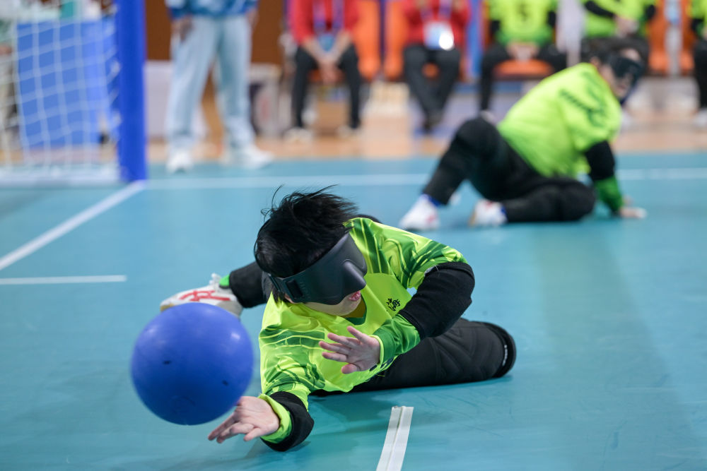 12月8日,在广州举行的全国第十二届残疾人运动会暨第九届特殊奥林匹克运动会盲人门球项目女子组小组赛中,浙江队13:3战胜上海队。新华社记者 胡智轩 摄