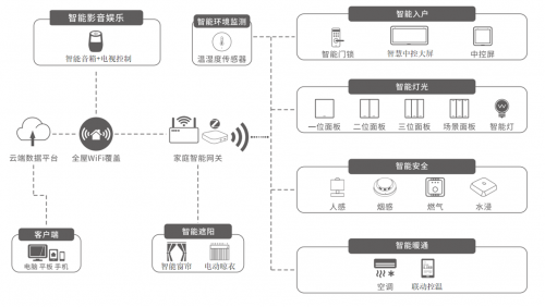 1. 全屋智能家居场景。基础配置涵盖智能锁、烟感探测器、燃气泄漏报警器、人体存在传感器、智能窗帘、音响、开关及照明设备,同时提供推窗器等可选配置。这一系统充分体现“以人民为中心”的发展思想,既落实“居住品质提升”“适老化改造”等民生政策,又通过科技手段精准匹配业主多样化居住需求,打造安全舒适的智慧家居环境。