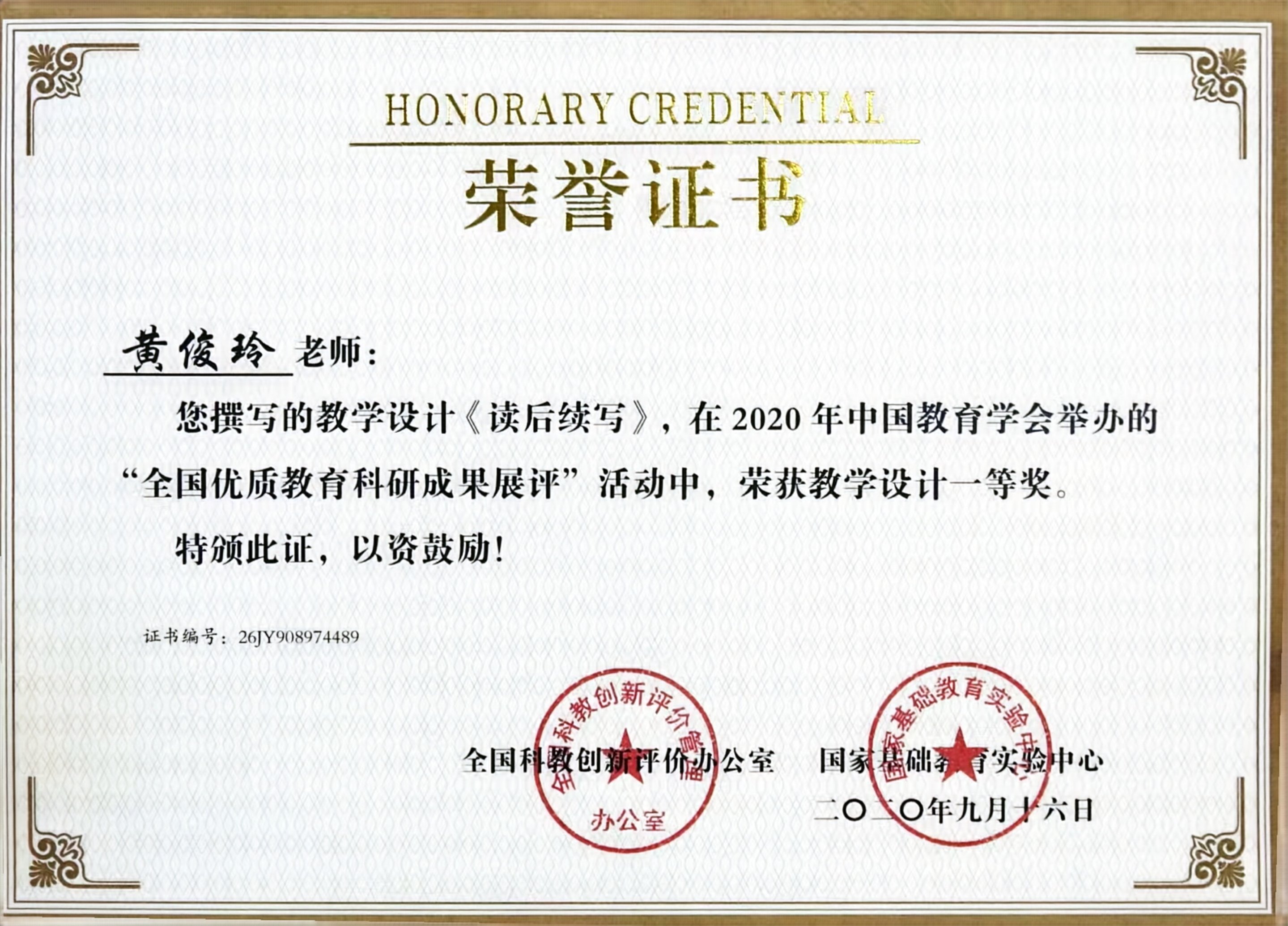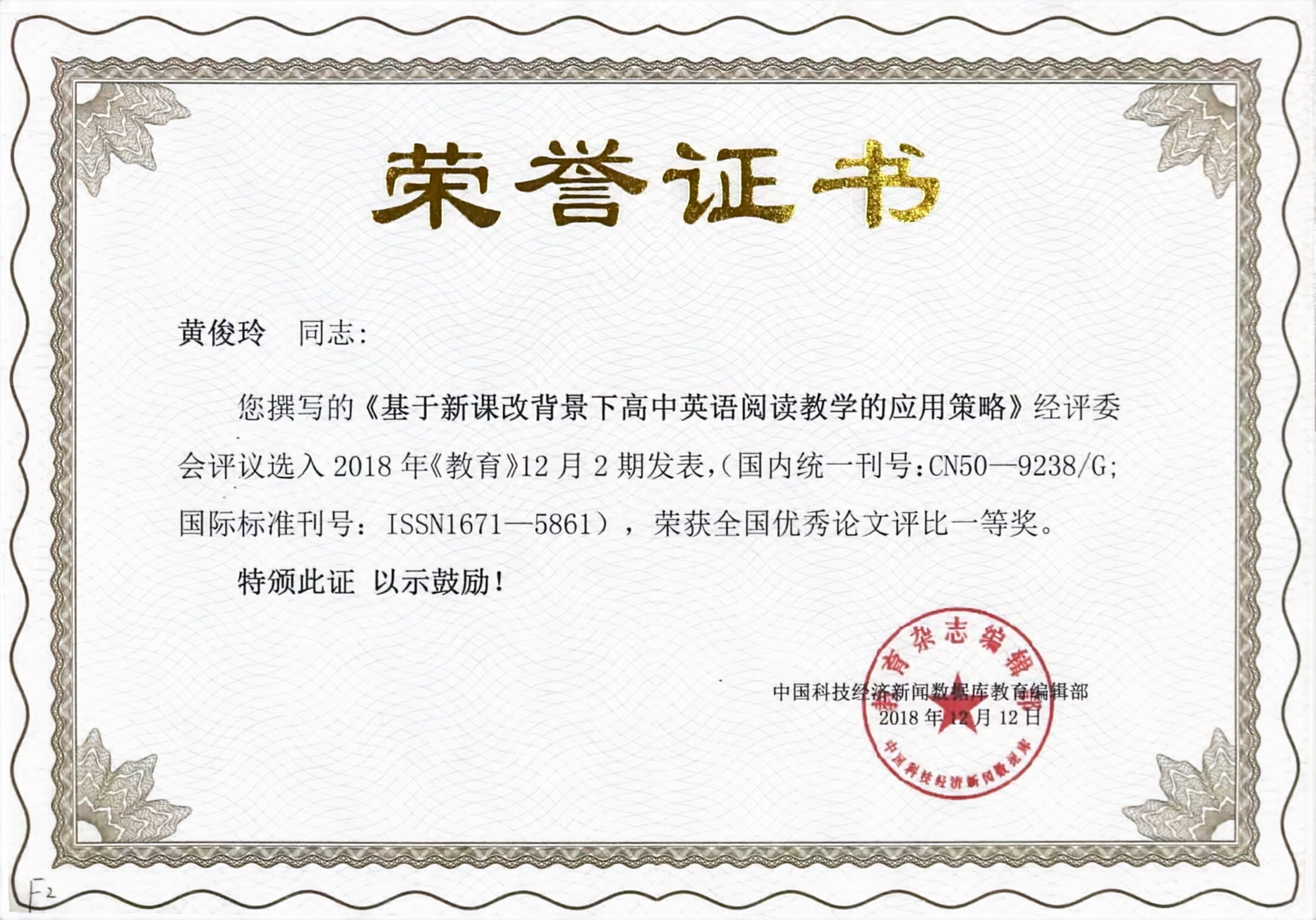 作为学校英语教研组长,黄俊玲老师从未停下成长的脚步。她深知,要给学生一杯水,自己就得有一桶源源不断的活水。她一头扎进新课改的研究里,熬夜打磨教学设计,反复推敲教学方法,撰写的《基于新课改背景下高中英语阅读教学的应用策略》入选核心期刊并获全国优秀论文一等奖,《读后续写》教学设计也在全国评比中摘得桂冠。