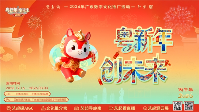 为响应“请到广东过大年”号召,推动互联网条件下的新大众文艺繁荣发展,“粤新年·创未来”2026年广东数字文化推广活动将于2025年12月16日至2026年3月3日期间举办。本次活动由广东省文化馆、广东省文化馆联盟主办,广东省各级文化馆承办,以“粤新年·创未来”为主题,以新媒体(视频号、微信公众号)、服务平台为主要阵地,采用“线上+线下”的方式,围绕“艺起探AIGC”“文化推介官”“艺起寻岭南”“艺起逛云展”“艺起看直播”五大核心板块组织系列丰富多彩的数字文化惠民活动,集中展现百馆联动开展数字文化惠民服务的生动景象,为老百姓奉献一场指尖上的“文化盛宴”。