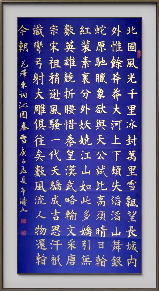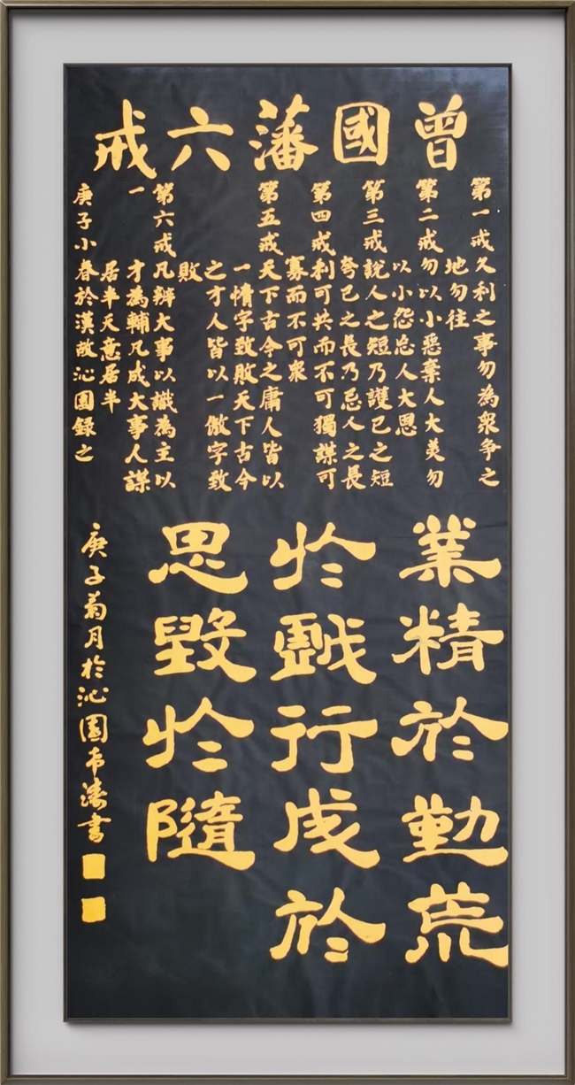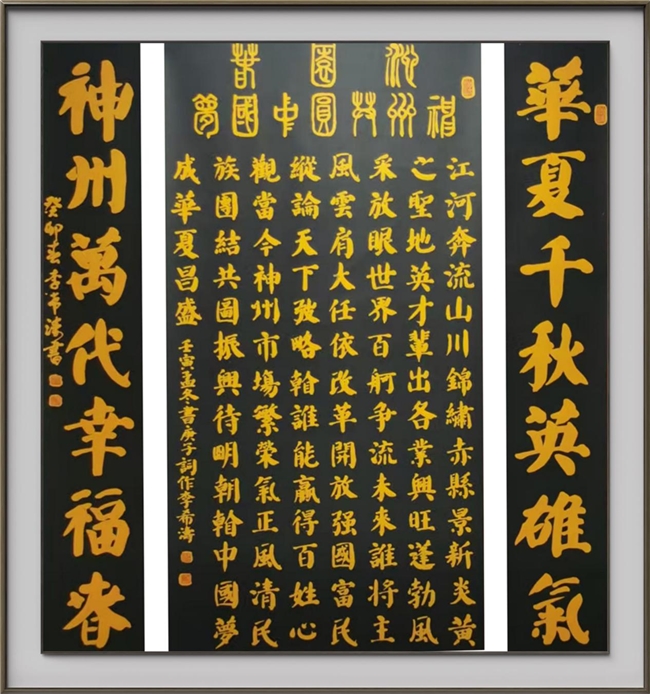 李希涛老师的书法根基,深植于传统沃土且独具个性锋芒。作为中国书法家协会会员、国家特级书法师,他楷书根正字俊,榜书雄浑大气,行书气韵流畅,草书豁达奔放,正如著名书法家张海点评:“希涛书作体现了严正、流畅、雄强、古拙,兼具凝重洒脱与端庄大气”。从颜楷55米《中华字经》长卷的恢弘,到沁园春“神州共圆中国梦”被人民大会堂收藏的殊荣,其作品既获70余次全国及省市奖项加持,更作为国宾礼联通中外,彰显“建党百年功勋艺术家”的家国情怀。