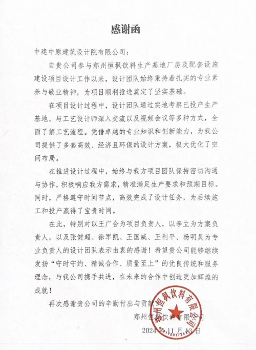 近日,由中建中原建筑设计院承接的河南省郑州市经开区重点产业项目 ——郑州恒枫(娃哈哈)饮料生产基地厂房及配套设施建设项目圆满竣工。设计团队凭借卓越的设计品质、高效的响应能力与全程护航的专业服务,赢得业主高度赞誉并获赠感谢函。