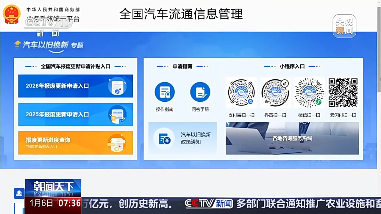 此外,消费者可以通过电脑登录“全国汽车流通信息管理系统”,点击“汽车以旧换新”专题进入申请页面。也可以在相关网络平台的“汽车以旧换新”小程序上进行申请。