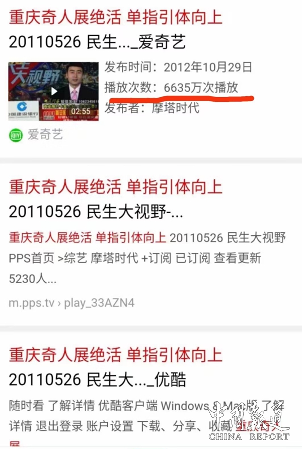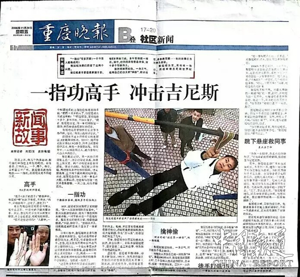 这一成就获得世界纪录协会认证,其事迹被收录进《当代中华武术人物大辞典》,人民网、央视网、中国广播网等国家级媒体纷纷报道。其中有一个视频,在爱奇艺平台一夜之间达6635万次播放,实现全民级传播。2006年,《重庆晚报》《巴渝都市报》等地方媒体率先报道其“一指功”冲击吉尼斯纪录的事迹,引发社会广泛关注。