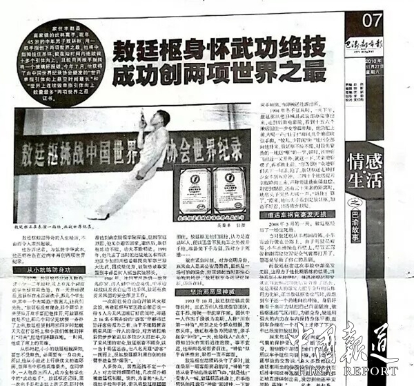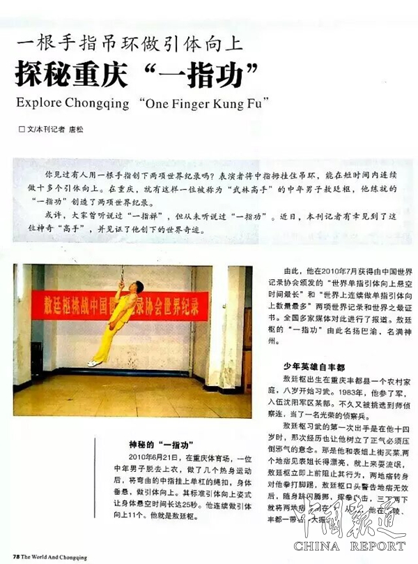 一指惊世,16年不破的世界纪录 2010年6月21日,敖廷枢创下了世界上连续做单指引体向上数量最多(11次)和单指引体向上悬空时间最长(25秒)两项世界纪录。这两项纪录尘封16年至今不破,源于他取少林精华,吸太极精髓,凝练的武功秘籍《敖氏大力金刚劲》功法。这套功法将全身筋骨劲力汇聚一指,完美诠释了“内练一口气,外练筋骨皮”的武学精髓。《敖氏大力金刚劲》造就了至今16年未被超越的传奇。