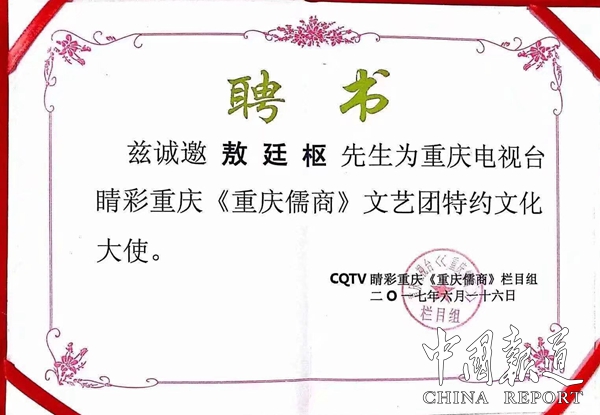 跨界深耕,传承武学担使命 敖廷枢的影响力不仅限于武术与文化领域,更延伸至商业与社会活动中:文化与传媒领域:2015年,他受邀成为中国剧作家协会纪实电影《寻找真功夫》顾委会委员;2017年被重庆电视台《重庆儒商》栏目聘为特约文化大使,被《特色重庆》栏目聘为特邀顾问。