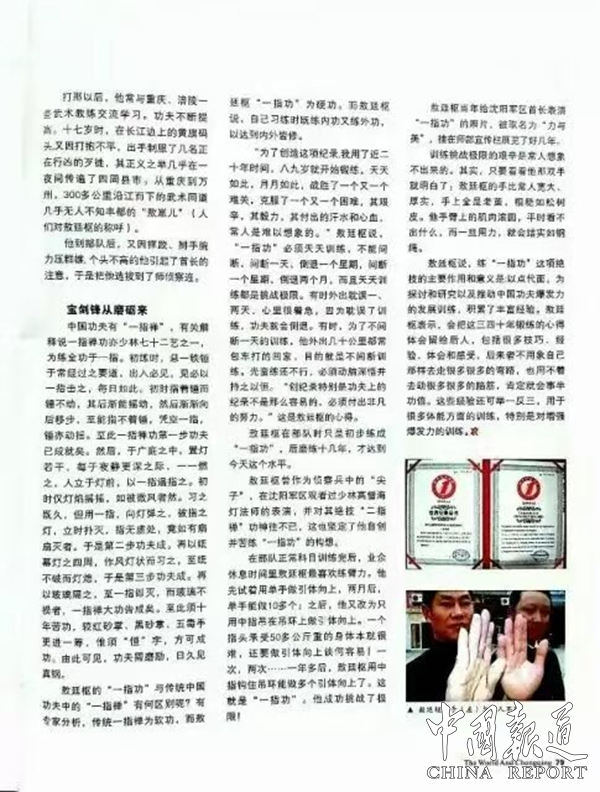 作为欧洲搏击领域标杆刊物,《功夫与搏击》(欧洲版)则以《一指破局:敖廷枢的实战功夫》聚焦其一指门综合搏击的实战价值,将其技法与欧洲搏击术对比解读,盛赞其一指功“精准、刚猛、高效,兼具擒拿与杀伤双重属性,具有以点破面、四两拨千斤的发力智慧,为欧洲搏击从业者带来全新启发”。报道中还收录其协助公安擒拿“川东第一神偷”、一掌吓退地痞护少女、跳悬崖救同事致骨折仍坚守救人的侠义事迹,直言“敖的功夫不止于技,更在于侠,这是东方武术独有的精神魅力,也是其超越技法本身的动人之处。