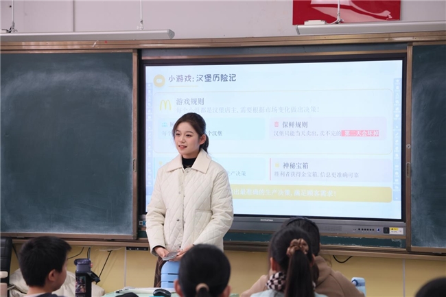 课堂上,实践队员以“寓教于乐”为理念,将财经知识融入趣味游戏中。“汉堡店经营”模拟市场运营,让学生在角色体验中理解供给与需求的关系;“物品竞拍”环节则引导学生认识股票、比特币、黄金等资产的经济价值,并延伸至学习与生活场景,强调在决策前评估价值、预判风险的重要性。课程通过问答、小组竞赛等形式,充分调动学生参与热情,使抽象的财经概念变得可感可知。
