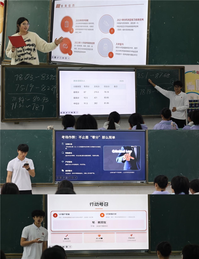 活动首日以“学风引领,梦想启航”为主题展开。实践队成员张婧怡主持开场,简要阐明活动宗旨与安排。随后,李宜学作《新时代 新学风》主题宣讲,生动阐释优良学风的内涵与养成路径。朱泰宇则从福建师范大学的校训精神出发,强调“学风即赛风,诚信即根本” “ 学风正则赛风清”,引导学生树立纪律意识与奋斗信念。在下午的活动中,吴宇欣结合自身体考经历与大学生活进行分享,贴近学生实际,拉近与学生的心理距离;李宜学进一步对体育单招政策进行专业解读,为学生生涯规划提供清晰指引。罗捷尹主持的“时光胶囊”环节,引导学生在明信片上书写寄往未来的信,由实践队统一保管,寄托青春理想,强化成长内驱。