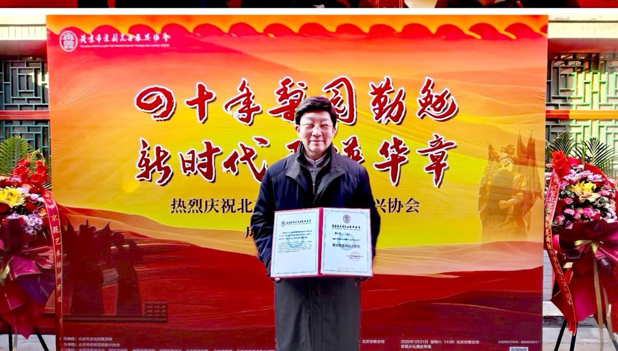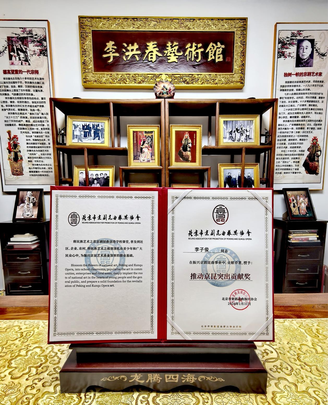 李洪春故居文化传承院院长李子俊,作为梨园世家的杰出代表,以其深厚的艺术底蕴和卓越的文化成就,在梨园文化界享有赞誉,荣获北京京昆振兴协会成立40周年“推动京昆突出贡献奖”表彰。