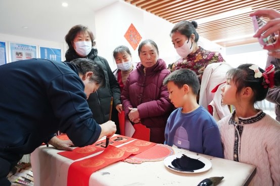 此次演出汇聚了石景山区文联所属舞蹈家协会、音乐家协会、书法家协会、美术家协会的文艺骨干们,大家纷纷献艺,为社区的居民送上美好的新春祝福!为了更好地满足居民的精神文化需求,增添春节的年味儿,现场还增加了现场送福送联环节,书法老师们用手中的毛笔现场写出对广大群众最深切的新春祝福!文艺表演结束后,写春联送福活动温情启幕。区书法家协会副主席许金魁、理事王德峰,美术家协会副主席孟浩等老师现场挥毫泼墨,笔走龙蛇间,一幅幅寓意吉祥的春联、一个个饱含祝福的“福”字跃然纸上。居民们有序排队,领取专属的新春祝福,脸上洋溢着幸福的笑容,将现场氛围推向高潮。