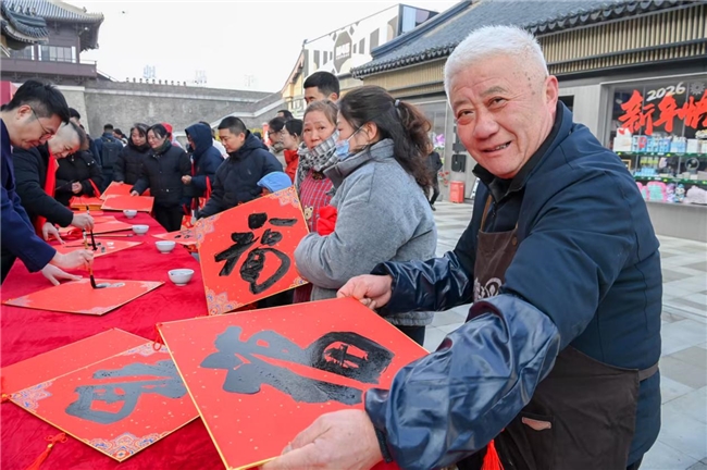 开展仪式后,“为民送福”活动暖心开启。参展书画名家们现场挥毫泼墨,一张张红彤彤的“福”字从笔端流淌而出,凝聚着马年的美好祝福,承载着浓浓的新春温情。市民游客争相领取,欢声笑语不断,墨香与年味交织,让西溪的新春更添温暖与诗意。