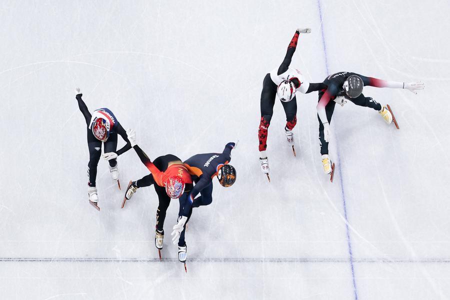 2月12日,孙龙(左二)冲过终点线。新华社记者 陈益宸 摄