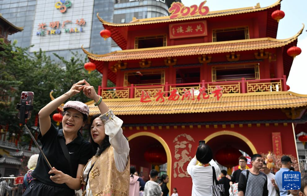 2月15日,在广州越秀西湖花市,游客拍照留念。