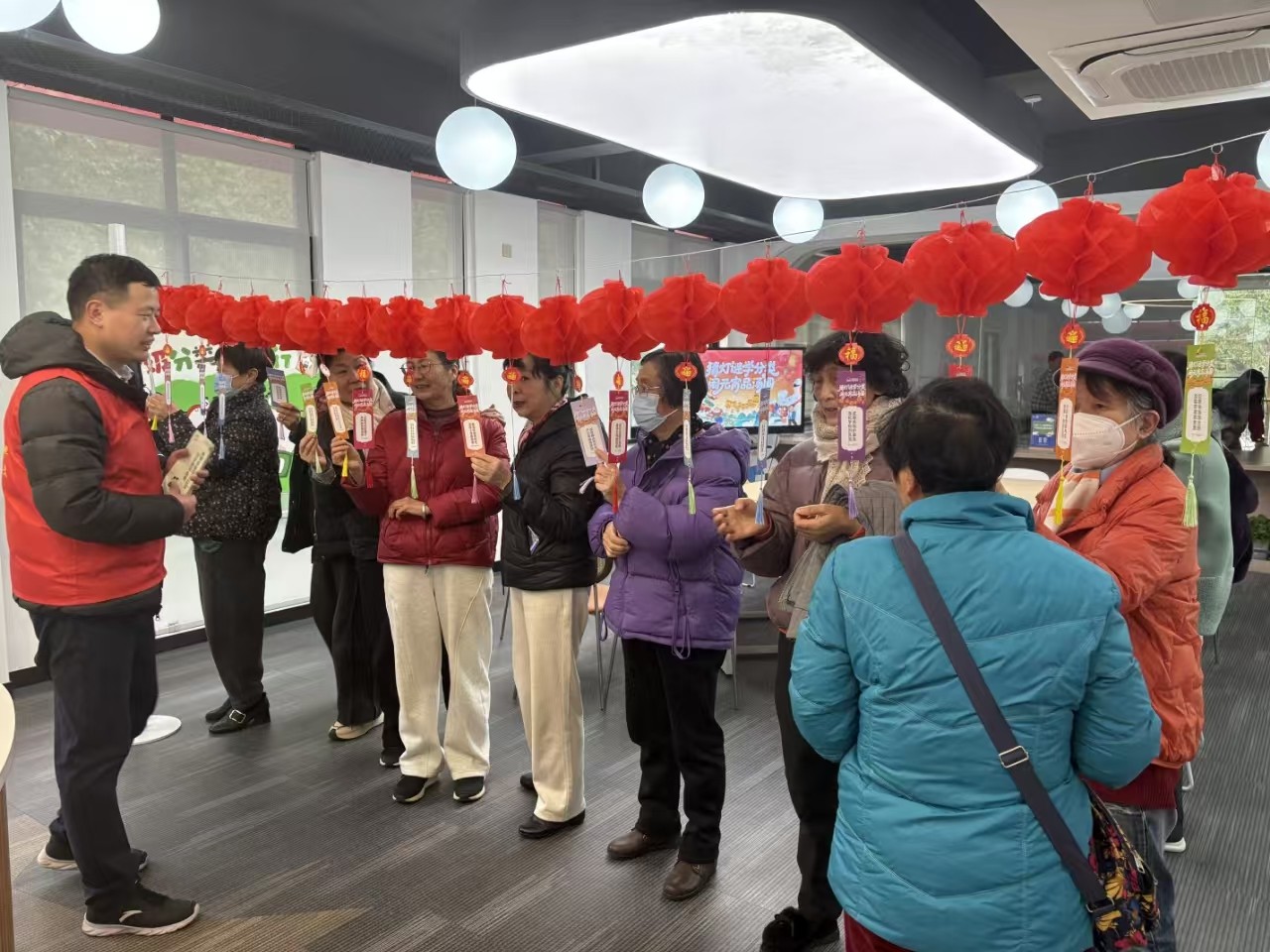 活动现场张灯结彩、气氛热烈。一串串红灯笼高高悬挂,一条条精心制作的灯谜随风轻摆,与整洁有序的社区环境相映成趣。与普通灯谜不同,本次灯谜由社区工作人员结合生活实际专门设计,内容紧扣垃圾分类主题:“小盒子,用处大,红蓝绿灰要记下;干湿有害分开投,文明社区人人夸”“吃完汤圆剩碗底,汤水沥干归哪类”…… 一道道贴近生活、通俗易懂的谜题,既保留了元宵猜谜的传统趣味,又巧妙融入垃圾分类知识,吸引居民纷纷驻足品读、互相探讨。
