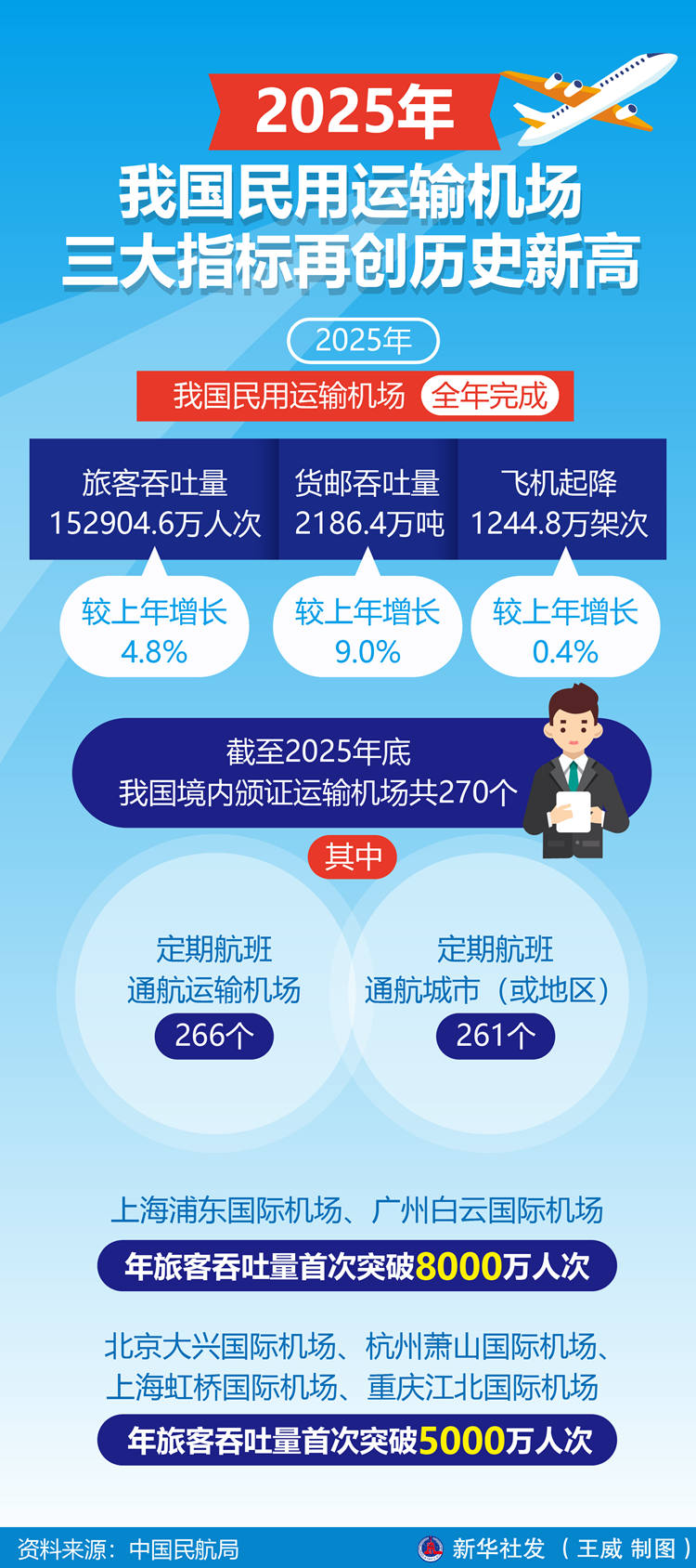 中国民航局当日公布2025年全国民用运输机场生产统计公报。公报显示,截至2025年底,我国境内颁证运输机场共270个,其中定期航班通航运输机场266个,定期航班通航城市(或地区)261个。