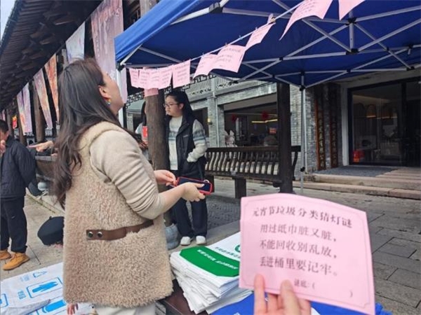 凤卧镇的分类宣讲员则走进村居、走入家庭,针对元宵期间易产生的易腐垃圾进行重点指导:“大家包汤圆时剩下的边角料,家里没吃完的过期的食材,都要投放进绿色易腐垃圾桶内。”生动的举例让居民一目了然。而在山门镇,环卫所工作人员深入窗口单位、酒店、商超等场所,结合元宵特点讲解汤圆残渣、废弃灯笼、节日礼盒的正确分类方法,将环保知识精准送到群众身边。