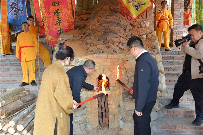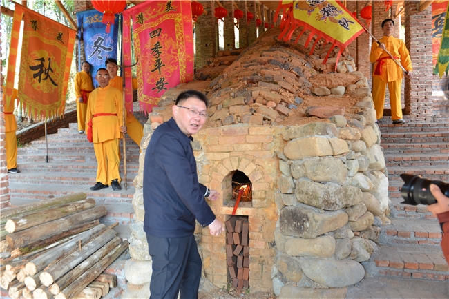 在全场领导、嘉宾与乡亲们的共同见证下,万众期待的点火仪式正式启幕。德化县委常委、宣传部长黄世兴担任主点火嘉宾,浔中镇、县农业局、县文旅局、县陶瓷办等相关单位领导及陶瓷界代表作为助点火嘉宾联袂登台,接过点火火把,在全场齐声倒计时中,将火种缓缓送入窑膛。刹那间,熊熊窑火冲天燃起,映红古窑遗址、照亮春日山村,瑞狮围窑欢腾跃动,现场掌声雷动、喝彩不绝,仪式感满满。这簇跃动不息的窑火,是千年制瓷技艺的薪火相传,是初溪窑文化复兴的全新起点,更象征着德化陶瓷非遗文化在新时代生生不息、永续传承。
